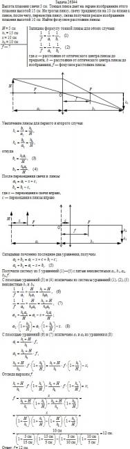 Высота пламени свечи 5 см. Тонкая линза дает на экране изображение этого пламени высотой 15 см. Не трогая линзу, свечу придвинули на 10 см ближе к линзе, после чего, переместив линзу, снова получили резкое изображение пламени высотой 10 см. Найти фокусное расстояние линзы.