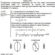 Поляризатор и анализатор установлены так, что угол между плоскостями пропускания равен 60°. Определить во сколько раз уменьшится интенсивность естественного света при прохождении через них, если потери составляют 5% в каждом.