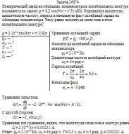 Электрический заряд на обкладках конденсатора в колебательном контуре изменяется по закону q = 0,2 cos(4πt + π/3) мКл. Определите амплитуду, циклическую частоту, период и начальную фазу колебаний заряда на обкладках конденсатора. Чему равна амплитуда силы тока в этом колебательном контуре?