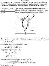 На мыльную пленку нормально к поверхности падает свет с длиной волны 600 нм. Отраженный свет максимально усилен вследствие интерференции. Определить минимальную толщину плёнки. Показатель преломления 1,3.