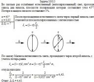 Во сколько раз ослабевает естественный (неполяризованный) свет, проходя сквозь два николя, плоскости поляризации которых составляют угол 45°? Потери в каждом николе составляют 5%.