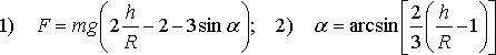 Шайба массой m скользит без трения с высоты h по желобу, переходящему в петлю радиусом R. Определите 1) силу давления F шайбы на опору в точке, определяемой углом и 2) угол α, при котором произойдет отрыв шайбы.
