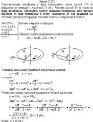 Горизонтальная платформа в виде однородного диска массой 270 кг вращается по инерции с частотой 10 об/с. Человек массой 60 кг стоит на краю платформы. Определить частоту вращения платформы, если человек перейдет от края платформы в точку удаленную от оси вращения на половину радиуса платформы. Человека считать материальной точкой.