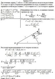 Два точечных заряда (71 нКл и –18 нКл) находятся в воздухе на расстоянии 42 см друг от друга. Определить напряжённость поля, создаваемого этими зарядами в точке на расстоянии 17 см от первого и 31 см от второго зарядов.