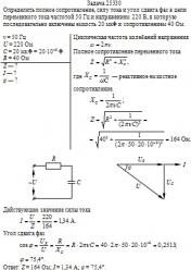 Определить полное сопротивление, силу тока и угол сдвига фаз в цепи переменного тока частотой 50 Гц и напряжением 220 В, в которую последовательно включены емкость 20 мкФ и сопротивлением 40 Ом.