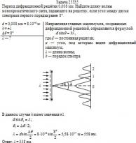 Период дифракционной решётки 0,008 мм. Найдите длину волны монохроматического света, падающего на решетку, если угол между двумя спектрами первого порядка равен 8°.