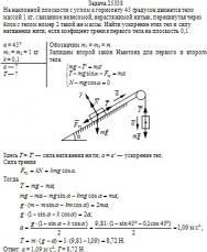 На наклонной плоскости с углом к горизонту 45 градусов движется тело массой 1 кг, связанное невесомой, нерастяжимой нитью, перекинутой через блок с телом номер 2 такой же массы. Найти ускорение этих тел и силу натяжения нити, если коэффициент трения первого тела на плоскость 0,1.