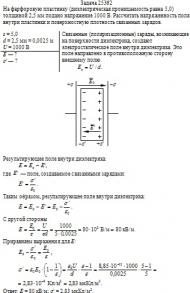 На фарфоровую пластинку (диэлектрическая проницаемость равна 5,0) толщиной 2,5 мм подано напряжение 1000 В. Рассчитать напряженность поля внутри пластинки и поверхностную плотность связанных зарядов.