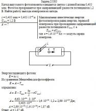 Катод вакуумного фотоэлемента освещается светом с длиной волны 0,405 мкм. Фототок прекращается при задерживающей разности потенциалов 1,2 В. Найти работу выхода электронов из катода.