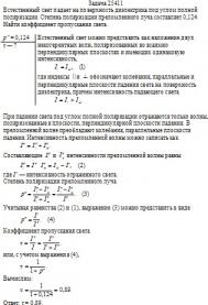 Естественный свет падает на поверхность диэлектрика под углом полной поляризации. Степень поляризации преломленного луча составляет 0,124. Найти коэффициент пропускания света.