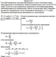 Плоский конденсатор заполнен диэлектриком и на его пластины подана некоторая разность потенциалов. Энергия конденсатора в этом случае W = 20 мкДж. После того, как конденсатор отключили от источника напряжения, диэлектрик вынули из конденсатора. Работа, которую надо было совершить против сил электрического поля, чтобы вынуть диэлектрик, А = 70 мкДж. Определить диэлектрическую проницаемость ε диэлектрика.