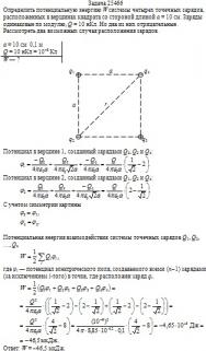 Определить потенциальную энергию W системы четырех точечных зарядов, расположенных в вершинах квадрата со стороной длиной a = 10 см. Заряды одинаковые по модулю, Q = 10 нКл. Но два из них отрицательные. Рассмотреть два возможных случая расположения зарядов.