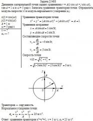 Движение материальной точки задано уравнением r = A(i·cos ωt + j·sin ωt), где A = 1 м и ω = 5 рад/с. Записать уравнение траектории точки. Определить модуль скорости |v| и модуль нормального ускорения |a