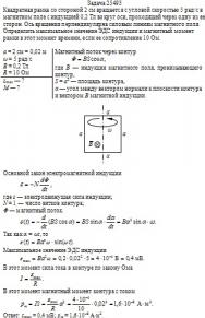 Квадратная рамка со стороной 2 см вращается с угловой скоростью 5 рад/с в магнитном поле с индукцией 0,2 Тл вокруг оси, проходящей через одну из ее сторон. Ось вращения перпендикулярна силовым линиям магнитного поля. Определить максимальное значение ЭДС индукции и магнитный момент рамки в этот момент времени, если ее сопротивление 10 Ом.