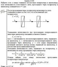 Найдите угол φ между главными плоскостями поляризатора и анализатора, если интенсивность естественного света, проходящего через поляризатор и анализатор уменьшится в n = 3 раз.