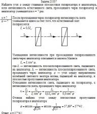 Найдите угол φ между главными плоскостями поляризатора и анализатора, если интенсивность естественного света, проходящего через поляризатор и анализатор уменьшится в n = 7 раз.