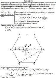 В вершинах правильного шестиугольника расположены пять положительных и один отрицательный заряды. Найти напряженность электрического поля в центре шестиугольника при различном расположении этих зарядов. Величина каждого заряда q = 3·10