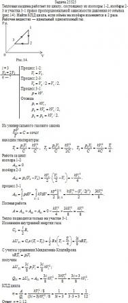 Тепловая машина работает по циклу, состоящему из изохоры 1-2, изобары 2-3 и участка 3-1 прямо пропорциональной зависимости давления от объёма (рис.14). Найти КПД цикла, если объём на изобаре изменяется в 2 раза. Рабочее вещество — идеальный одноатомный газ.