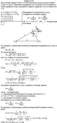 Два точечных заряда 20 нКл и –30 нКл находятся в воздухе на расстоянии 5 см друг от друга. Определить напряжённость и потенциал поля создаваемого этими зарядами в точке, удаленной от первого заряда на 4 см, а от второго на 3 см.