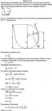 Небольшое тело начинает скользить с высоты h по наклонному жёлобу, переходящему в полуокружность радиуса h/2. Пренебрегая трением, найти высоту, на которую поднимется тело в момент отрыва от жёлоба.