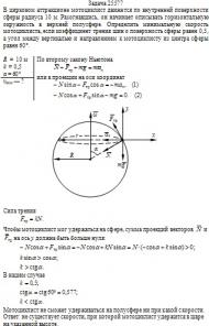 В цирковом аттракционе мотоциклист движется по внутренней поверхности сферы радиуса 10 м. Разогнавшись, он начинает описывать горизонтальную окружность в верхней полусфере. Определить минимальную скорость мотоциклиста, если коэффициент трения шин о поверхность сферы равен 0,5, а угол между вертикалью и направлением к мотоциклисту из центра сферы равен 60°.