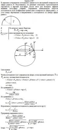 В цирковом аттракционе мотоциклист движется по внутренней поверхности сферы радиуса R. Разогнавшись, он начинает описывать горизонтальную окружность в верхней полусфере. После этого для большего эффекта нижнюю полусферу убирают. Определите минимальную скорость мотоциклиста, если коэффициент трения шин о поверхность сферы равен μ, а угол между вертикалью и направлением к мотоциклисту из центра сферы равен α.