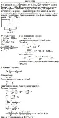 = 1,00 м. Проходное отверстие крана совпадает с сечением трубки. В один из баков налита вода до высоты h = 50,0 см, второй бак вначале пустой. В момент t = 0 кран открывают. Определить: а) характер течения воды в трубке в первые секунды, б) время τ, по истечении которого разность уровней воды в баках уменьшается в e раз. Вязкость воды принять равной η = 1,00·10