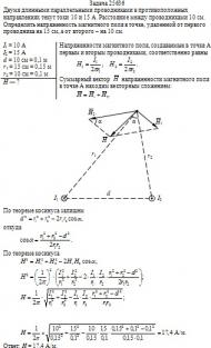 Двумя длинными параллельными проводниками в противоположных направлениях текут токи 10 и 15 А. Расстояние между проводниками 10 см. Определить напряженность магнитного поля в точке, удаленной от первого проводника на 15 см, а от второго – на 10 см.