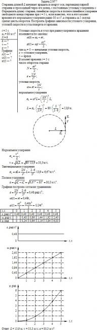 Стержень длиной L начинает вращаться вокруг оси, перпендикулярной стержню и проходящей через его конец, с постоянным угловым ускорением ε. Определить длину стержня, линейную скорость и полное линейное ускорение свободного конца стержня при t = 5 с, если известно, что в этот момент времени его нормальное ускорение равно 80 м/с