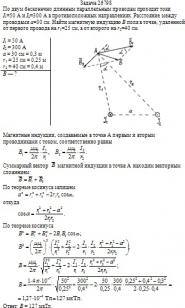 =300 А в противоположных направлениях. Расстояние между проводами a=30 см. Найти магнитную индукцию В поля в точке, удаленной от первого провода на r